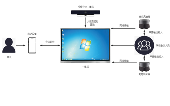 在線家長會通過學校在會議室的電腦上安裝連接視頻會議一體機(C30R)、以及在會議室桌面擺放多臺級聯(lián)麥克風音箱(A20),家長通過使用手機、平板或電腦結合會議軟件進行實時的線上家長會議。